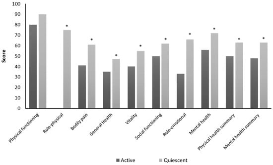 Comparison of health-related quality of life (HRQoL) between the active and the quiescent Crohn’s disease group. * p < 0.05