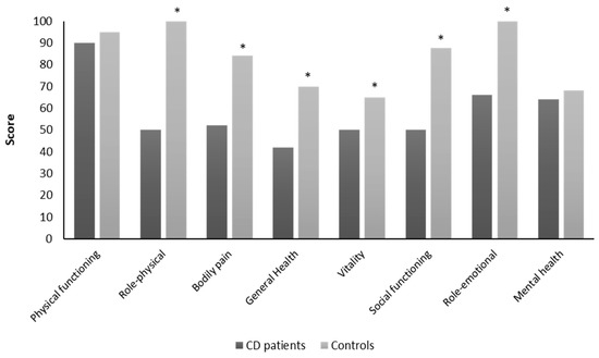 Comparison of health-related quality of life between the CD patients and controls. * p < 0.05.