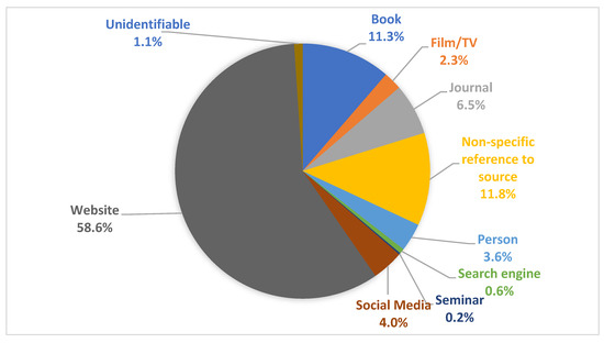 From the six discussion forums analysed, 476 comments, made by 307 learners, contained links or other sources of nutrition information that learners were sharing. Figure 2 (and Appendix A Table A5) summarises the sources of nutrition information learners accessed. A range of sources were referenced by learners, with the most common being online websites. Books, films and TV shows, social media and scientific journals were also sources of information referenced by learners. Interestingly, learners also referenced individual people as a source of information. Some nutrition information sources were identified as ‘non-specific reference to source’, meaning learners provided a reference to nutrition information without identifying the source type, e.g., a reference to the “Blood Type Diet” but did not reference whether this information was from a book, website, scientific paper, etc. Five sources were classified as ‘unidentifiable’ for reasons including not being in English or were unable to be located.