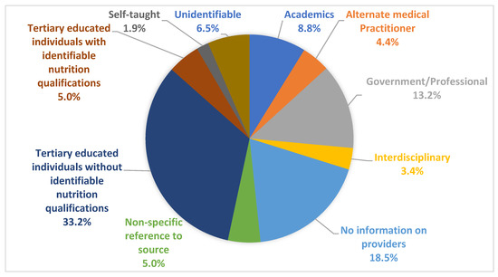 The most common vocational background of providers, tertiary educated individuals without identifiable nutrition qualifications, was further categorised by their tertiary education and training. Thirty-seven percent of this group were medical doctors/had a medical degree, while three percent had a health care professional degree such as physiotherapy. Twenty-six percent of providers were categorised as ‘scientists’—individuals with a university tertiary degree in a science subject, but without health/medical training. Forty-three percent had professional training in areas unrelated to nutrition/medicine/science or health, such as journalism, economics, law and hospitality. Thirteen sources of nutrition information had multiple provider types from multiple vocational backgrounds, and, of these, nine included a nutrition expert.
