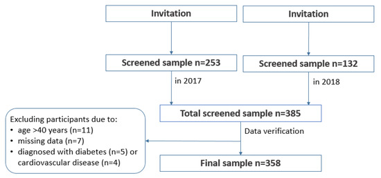 The study was designed as a cross-sectional with convenience sampling. The participants were recruited through direct advertising, while using posters, leaflets, and communication with human resources departments of local employers. The recruitment was carried out in public and private sector workplaces that were located in Olsztyn city and around the city to cover urban, sub-urban, and rural areas of Warmia and Mazury region. The intent was to recruit men from different age groups, of all education levels and employment status (e.g., white vs. blue collars). The advertising of the study included sites, such as university campus, city council, unemployment office, health centres, retail, courier services, gas and electricity suppliers, etc., to achieve the maximum variability of the study sample in regards to demographic and socioeconomic characteristics and best reflect the structure of the general population. A proportion of recruited participants were enrolled through further referrals. The participants who took part in the study were recommending the study to their peers in person or through their social media channels. The inclusion criteria were: males, aged 19–40, with the cognitive ability to understand and respond to questions that were asked by the interviewer, written consent to participate. The exclusion criteria were: females, and a cognitive impairment that would not allow for understanding and responding to questions that were asked by the interviewer. A total sample screened consisted of 385 men. In the preliminary analysis, a total of 26 men were excluded from further analysis, due to missing data (n = 7), not meeting the age criterion on the day of screening (n = 11), reporting cardiometabolic diseases: cardiovascular disease (n = 4) and diabetes (n = 5). Although cardiometabolic diseases were not an exclusion criterion in the study, for the purpose of this paper it was decided that affected men should be removed from further analysis, due to small number of such subjects (9) and potential bias caused by the medication used. Figure 1 presents details of the sample collection.