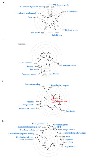 Diagrams of factor loadings that characterise each dietary-lifestyle pattern identified with principal component analysis. (A)—“Protein food, fried-food and recreational physical activity” pattern; (B)—““Sandwiches and convenient diet” pattern; (C)—““Fast foods and stimulants” pattern; (D)—““Healthy diet, active, past smokers” pattern; Only factor loadings of >|0.30| are shown for simplicity. Total variance explained by four dietary-lifestyle patterns is 32.2%. The factor loadings for “lard” and “screen time” were <|0.30| in all factors, hence the data are not shown.