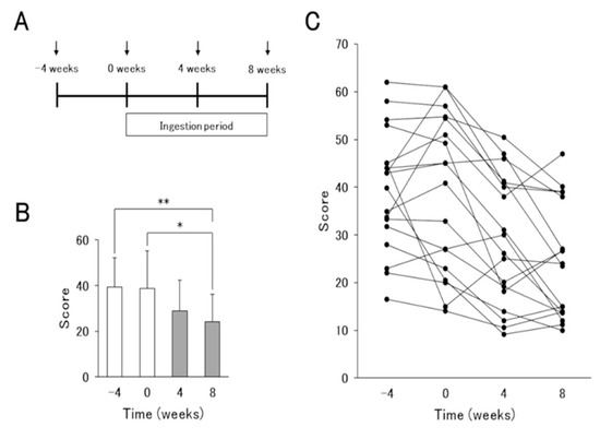 Results of the severity scoring of atopic dermatitis (SCORAD) index before and after L. lactis 11/19-B1-containing yogurt ingestion for 8 weeks. (A) Schematic representation of the experiment. Arrows indicate the times of the severity assessment and blood sampling in atopic dermatitis (AD) patients. (B) Average and (C) changes in individual volunteers in the SCORAD index associated with the ingestion of L. lactis 11/19-B1-containing yogurt are shown. Results are expressed as the means ± SD of 18 independent subjects. * p < 0.05, ** p < 0.01 by a Steel–Dwass test for multiple comparisons.