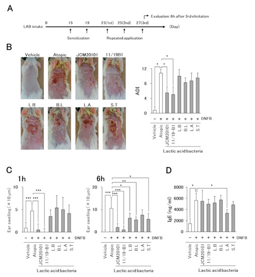 Effects of L. lactis 11/19-B1 intake on the development of 1-fluoro-2, 4-dinitrobenzene (DNFB)-induced AD-like symptoms. (A) Schematic representation of the experiment. (B) The severity of AD-like skin lesions was evaluated at 24 h after the repeated application of DNFB on day 25. Images are from a single experiment and are representative of each group (n = 4). (C) Ear swelling at 1 and 6 h after the last DNFB application (day 27) is shown. (D) The blood samples were collected at 6 h after the last DNFB application, and plasma total IgE was measured by ELISA. Results are expressed as the means ± standard deviation (SD) of four determinations for each group (n = 4). * p < 0.05, ** p < 0.01, *** p < 0.001 by Mann–Whitney U test. 1-fluoro-2, 4-dinitrobenzene (DNFB), vehicle group (Vehicle), atopic group (Atopic), lactic acid bacteria (LAB), L. lactis JCM20101 (JCM20101), L. lactis 11/19-B1 (11/19-B1), L. bulgaricus (L.B), B. lactis (B.L), L. acidophilus (L.A), S. thermophilus (S.T).