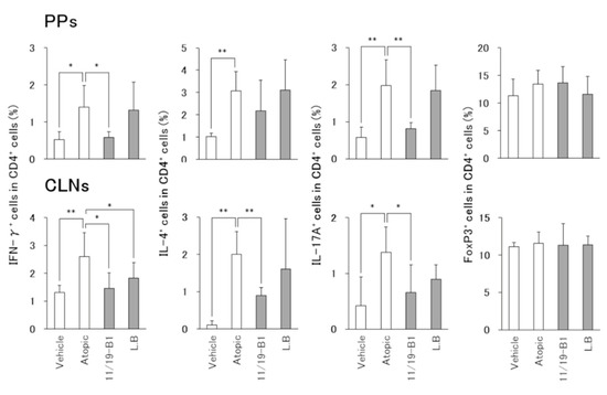 The atopic group had significantly increased numbers of IFN-γ–producing cells (Th1 cells), IL-4–producing cells (Th2 cells) and Th17A-producing cells (Th17 cells) in the PPs and CLNs compared to the vehicle group (Figure 3). In the L. lactis 11/19-B1 group, Th1 and Th17 cells were significantly decreased in the PPs, and Th1, Th2 and Th17 cells in the CLNs compared to the atopic group. In contrast, the L. bulgaricus group significantly reduced the number of Th1 cells in CLNs compared to the atopic groups. No changes in Treg cells were observed in any of the groups. These results indicated that the intake of L. lactis 11/19-B1 generally suppressed all subsets related to inflammation, i.e., Th1, Th2 and Th17, instead of activating of the suppressive system, Treg, in the AD mouse model.