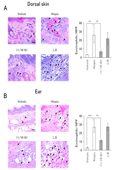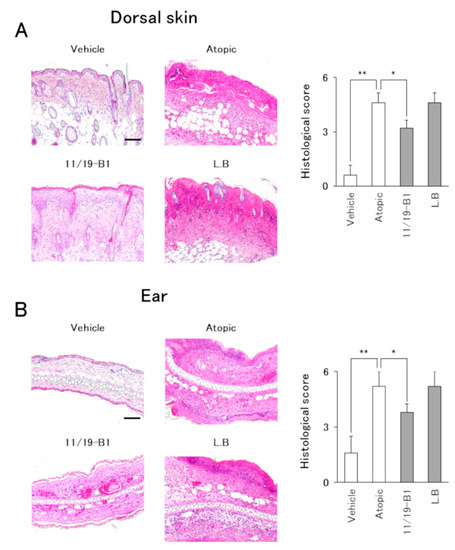 Dorsal skin and ear samples were fixed with 10% buffered neutral Formalin solution, paraffin-embedded, sectioned (3 µm), and subsequently stained with hematoxylin and eosin (HE) or an Eosinophil–Mast cell stain kit (Scy Tek Laboratories, UT, USA). HE-stained sections were evaluated using a semi-quantitative scoring system based on two criteria: (1) inflammatory cell infiltration and (2) epidermal erosion, using a light microscope (Olympus, Tokyo, Japan). The severity was scored as 0 = none, 1 = mild, 2 = moderate, or 3 = severe. Three sections from individual mice were blindly examined by a pathologist and the sum of the individual scores was compared between each group.