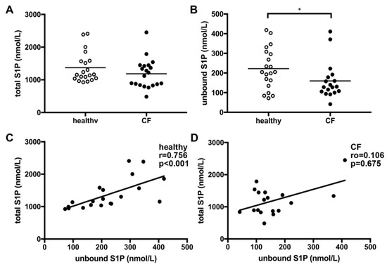 Plasma levels of total and unbound sphingosine-1-phosphate (S1P) in CF patients compared to healthy controls. Total S1P levels were measured by liquid chromatography (LC)–mass spectrometry (A), unbound S1P by ELISA (B). Significantly lower unbound S1P levels were found in CF patients compared to healthy controls after the exclusion of two statistical outliers (B). A positive correlation of unbound with total S1P levels was found for healthy controls (C), but not for CF patients (D). * p < 0.05.