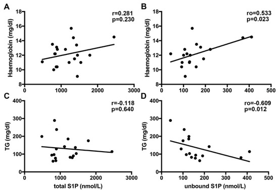 As S1P is an essential mediator regulating a variety of different cellular functions, we next compared laboratory parameters determined in CF patients at the time-point of blood drawing for S1P analysis with the measured S1P levels. We found a positive correlation of unbound S1P with hemoglobin (Figure 2B) and a negative correlation with TG (Figure 2D). No significant correlations of these parameters were found for total S1P levels measured by MS (Figure 2A,C). There was no correlation between measured S1P levels and any other laboratory parameters measured (presented in Table 2).