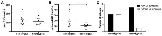 Higher unbound S1P levels in ∆F508-homozygous compared to ∆F508-heterozygous CF patients. No difference in total S1P levels measured by LC–MS was observed between ∆F508-homozygous and -heterozygous CF patients (A). Unbound S1P titers measured by ELISA were significantly higher in ΔF508-homozygous CF patients compared to ΔF508-heterozygous patients (B). A higher number of ΔF508-heterozygous CF patients had GI symptoms at time-point of S1P measurement compared to ΔF508-homozygous patients (C).