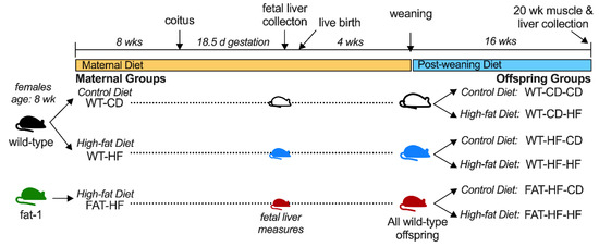 We previously reported that increasing the maternal and placental n-3:n-6 PUFA ratio mitigates many of the adverse programming effects of maternal high-fat diet on placenta inflammation and offspring liver and adipose tissue [17,18]. In these studies, we used the fat-1 (F1) transgenic mouse model, which endogenously converts n-6 PUFA to n-3 PUFA via ubiquitous expression of a novel Caenorhabditis elegans-derived n-3 desaturase under the β-actin promoter [19]. The fat-1 mouse has increased tissue levels of n-3 PUFA and n-3 PUFA-derived lipids [19,20]. Consistent with greater n-3 PUFA, fat-1 mice demonstrate reduced inflammation and less insulin resistance with high-fat feeding, despite the same dietary composition of n-3 and n-6 PUFAs [18,20,21,22]. Here, we hypothesized that a maternal high-fat diet would perturb oxidative metabolism and oxidative stress markers in fetal liver as well as adult skeletal muscle tissues, and that WT offspring of fat-1 transgenic dams would be protected from such deleterious effects of high-fat diet.