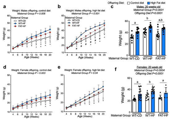 Maternal fat-1 transgene partially protects offspring from excess weight gain. Weight was measured from weaning to 20 wks in offspring of WT dams fed a control diet (WT-CD), or offspring of WT or fat-1 hemizygous dams fed a high-fat diet (WT-HF and FAT-HF, respectively) throughout pregnancy and lactation. All offspring were WT and were weaned to control or high-fat diet for male (a–c) or female (d–f) offspring. For males, n ≥ 10 per group. For females, n ≥ 5 per group. All data are presented as mean ± SD. * p < 0.05 for difference between WT-CD and WT-HF. ^ p < 0.05 for difference between WT-CD and FAT-HF. # p < 0.05 for difference between WT-HF and FAT-HF. Different letters above bars denote statistically significant differences between those bars at p < 0.05 significance level.