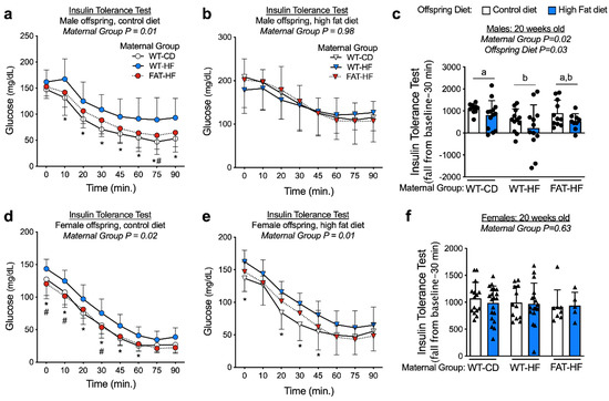 Insulin tolerance tests were performed with bolus i.p. insulin injection at 20 wks of age in the male and female WT offspring of WT-CD, WT-HF, and FAT-HF dams. Male offspring had similar fasting blood glucose levels (0 min), regardless of maternal group (Figure 4a,b). Female WT-HF offspring had elevated fasting glucose levels relative to WT-CD and FAT-HF offspring on a post-weaning control diet (Figure 4d) and elevated glucose levels relative to WT-CD offspring on a post-weaning high-fat diet (Figure 4e). Female offspring showed a significant effect of maternal group on glucose levels over time, where elevated blood glucose was observed in offspring of WT-HF dams, while offspring of FAT-HF dams tended to track with offspring of WT-CD dams (Figure 4d,e). Similar observations were made for male offspring on a post-weaning control diet, but no maternal group differences were observed for male offspring on a post-weaning high-fat diet (Figure 4a,b). To test for the effects of maternal group, post-weaning diet, and the interaction in all animals, we calculated the insulin tolerance test fall from baseline over 30 min as a single measure representing insulin effects on glucose disposal. In male offspring, there was a significant effect of maternal group, where offspring of WT-HF had less robust response to insulin bolus than WT-CD offspring (Figure 4c). This was not observed in the female offspring (Figure 4f). Males also appeared to have more profound effects of post-weaning diet on fall from baseline, where offspring on a post-weaning high-fat diet demonstrated lower fall from baseline compared with those on a post-weaning control diet (Figure 4c).