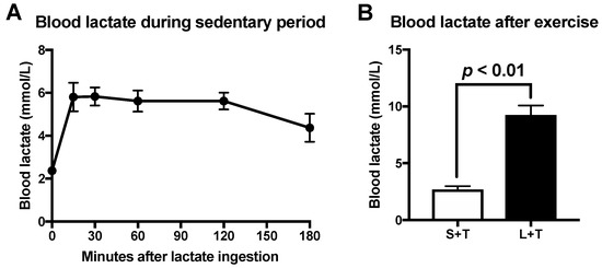 Blood lactate concentration following lactate ingestion during sedentary period (A). Blood lactate concentration immediately after the exercise (B). Data are presented as means ± SEM (n = 8).