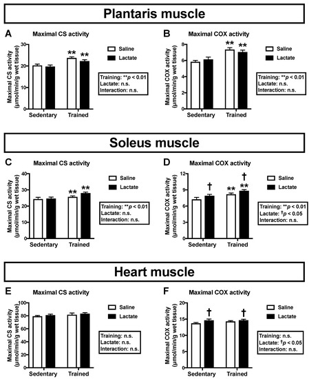 Maximal activities of CS (A, C, E) and COX (B, D, F) in the plantaris muscle (A, B), the soleus muscle (C, D), and the heart muscle (E, F) following 4-week lactate ingestion. Data are presented as means ± SEM (n = 8–9). ** p < 0.01: main effect of endurance training. † p < 0.05: main effect of lactate ingestion.