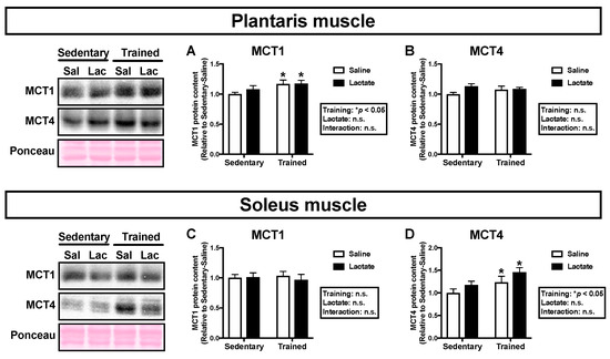 Because the transport of lactate across the sarcolemmal membrane is facilitated by MCT1 and MCT4, we analyzed MCT protein contents in the skeletal muscle [24]. Endurance training had a positive main effect on MCT1 protein content in the plantaris muscle (p < 0.05; Figure 3A) and MCT4 protein content in the soleus muscle (p < 0.05; Figure 3D). Lactate ingestion had no significant effect on MCT protein contents in either the plantaris muscle (Figure 3A,B) or the soleus muscle (Figure 3C,D).