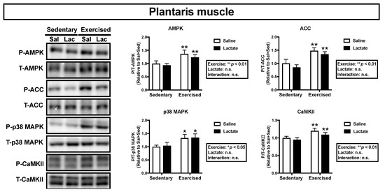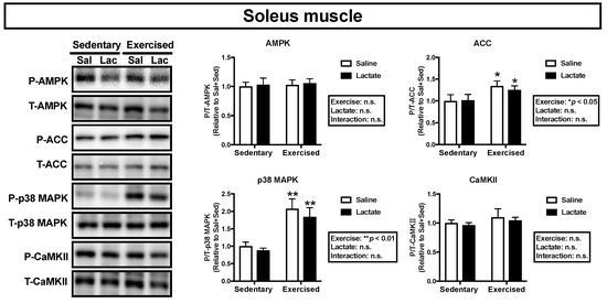 We assessed phosphorylation of the key proteins, AMPK, ACC, p38 MAPK, and CaMKII, which are associated with mitochondrial adaptations [21]. Endurance exercise had a main effect on phosphorylation of ACC and p38 MAPK in the plantaris muscle (ACC: p < 0.01, p38 MAPK: p < 0.01; Figure 4) and the soleus muscle (ACC: p < 0.05, p38 MAPK: p < 0.01; Figure 5) and on phosphorylation of AMPK and CaMKII in the plantaris muscle (AMPK: p < 0.05, CaMKII: p < 0.01; Figure 4). However, lactate ingestion had no significant effect on phosphorylation of these proteins (Figure 4 and Figure 5).