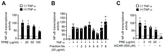 3.1. PRE Suppresses TNF-α-Induced NF-κB Activity