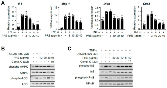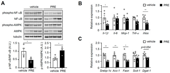 3.2. PRE Suppresses Pro-Inflammatory Gene Expression in Adipocytes