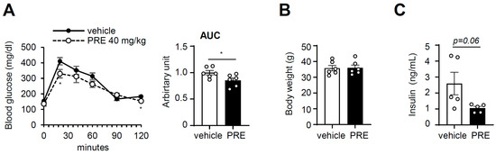 3.3. PRE Improves Obesity-Associated Systemic Glucose Tolerance
