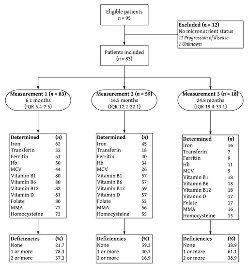Flowchart depicting study inclusion and follow-up measurements. Deficiencies are % of total. IQR interquartile range; Hb hemoglobin; MCV mean corpuscular volume; MMA methylmalonic acid.