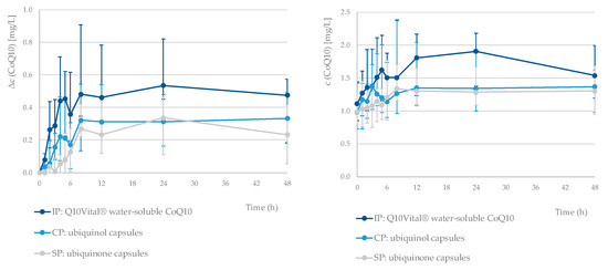 The following pharmacokinetic parameters were calculated: The time to reach peak plasma concentration (tmax), maximum total CoQ10 plasma concentration (cmax), maximum total CoQ10 plasma concentration above the baseline value (Δcmax), area under the total CoQ10 plasma concentration curve from the administration time to the last observation point (AUC48), and AUC48 above the baseline value (ΔAUC48). The AUC values were calculated according to the linear trapezoidal method. Baseline-corrected values (ΔAUC48, Δcmax) were calculated by subtracting the baseline values from the measured plasma concentration values. A pharmacokinetic analysis was performed using Stata Statistical Software, Release 15 (College Station, TX, USA, StataCorp LLC).
