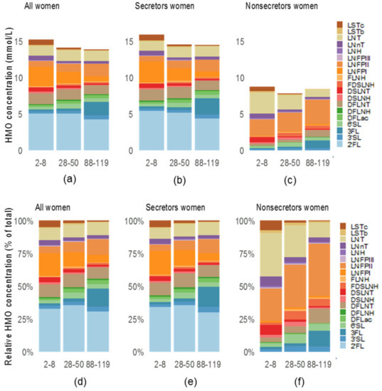 HMO absolute and relative abundance of women from the Brazilian cohort. Rio de Janeiro, Brazil. Median of absolute total HMO (mmol/L) (a–c) at 2–8, 28–50 and 88–119 days and relative abundance (d–f) at 2–8, 28–50 and 88–119 days concentrations of all women, according secretor status and follow-up points. DFLac, difucosyllactose; DFLNH, difucosyllacto-N-hexaose; DFLNT, difucosyllacto-N-tetrose; DSLNH, disialyllacto-N-hexaose; DSLNT, disialyllacto-Ntetraose; FDSLNH, fucodisialyllacto-N-hexaose; FLNH, fucosyllacto-N-hexaose; HMO, human milk oligosaccharide; LNFP, lacto-N-fucopentaose; LNH, lacto-N-hexaose; LNnT, lacto-N-neotetraose; LNT, lacto-N-tetrose; LSTb, sialyl-lacto-N-tetraose b; LSTc, sialyl-lacto-N-tetraose c; 2′FL, 2′-fucosyllactose; 3FL, 3-fucosyllactose; 3′SL, 3′-sialyllactose; 6′SL, 6′-sialyllactose.