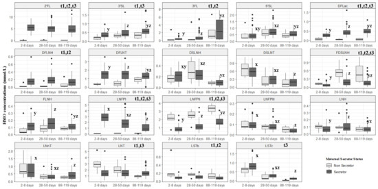 Box plot of secretor and non-secretor HMOs concentration of women from Brazilian cohort. Rio de Janeiro, Brazil. The description t1, t2 and t3 indicate differences between secretor and non-secretor concentration of according to Mann–Whitney, p < 0.05 for each time. x indicates that the HMO concentration at visit 1 is significantly different (p < 0.05) from the concentration at visit 2, y indicates that the HMO concentration at visit 1 is significantly different (p < 0.05) from the concentration at visit 3 and z indicates that the HMO concentration at visit 2 is significantly different (p < 0.05) from the concentration at visit 3 according to Friedman post-hoc test. A comparison between the times of non-secretor women was not performed.