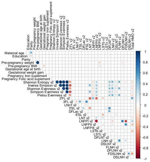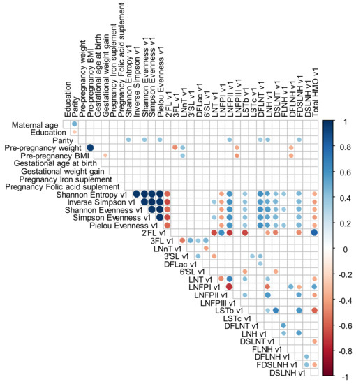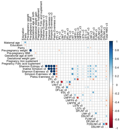 For exploratory analysis, a Spearman rank correlation with heat maps (Corrplot Package) was performed to investigate the correlation between maternal characteristics (age, education, parity, gestational age at birth, GWG, pregnancy iron and folic acid supplement and pre-pregnancy weight, pre-pregnancy BMI) and HMO individuals’ concentrations and alpha diversity index at the different time points. For these analyses, a significance level of <0.01 was adopted and correlations levels were interpreted as: 0.00 to 0.19—very weak correlation, 0.20 to 0.39—weak correlation, 0.40 to 0.69—moderate correlation, 0.70 to 0.89—strong correlation and 0.90 to 1.00—very strong correlation [44].