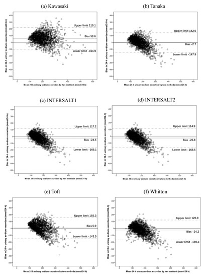 Bland–Altman plots showed that the Tanaka formula performed relatively accurately among the six formulas (Figure 1), which also showed that an overestimation of 24-hUNa excretion occurred at low levels of sodium excretion, whereas an underestimation occurred at high levels of sodium excretion. Compared with other formula, this trend was relatively inconspicuous in the Kawasaki formula.