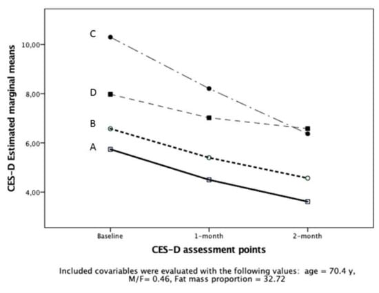 Changes in CES-D score according to time and intervention groups with adjustments for age, gender, and body fat proportion.