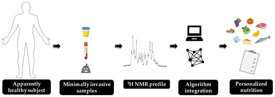 In order to introduce the advantages of metabolomics in the research of biomarkers, the common techniques used in metabolomics should be known. The two most common techniques used are nuclear magnetic resonance (NMR) spectroscopy and mass spectrometry (MS) hyphened to chromatographic techniques such as gas chromatography (GC), capillary electrophoresis (CE), liquid chromatography (LC), and ultra-high performance liquid chromatography (UHPLC). Each analytical platform has its own advantages and disadvantages, thus the choice of the platform principally depends on the objective of the study, the accessibility and expertise of the platform [18]. The NMR platform is proposed as an emerging tool for large-scale metabolomics studies in the personalized nutrition field. The NMR characteristics which make it a unique platform include its high level of experimental reproducibility, its simplicity in sample pre-processing and preparation, its capacity to handle diverse biofluids, its quantitative capabilities (with a high coverage and low detection limits [19]), and its utility in identifying unknown metabolites along with its non-destructive nature [20]. The inherent limitation of NMR is the low sensitivity compared to MS but there are emerging new NMR technologies that suggest a huge improvement in the NMR spectroscopy [21]. In order to highlight one of the NMR-approaches, quantitative proton 1H-NMR is the most useful NMR-based platform for metabolomics and has been successfully applied to early diagnostic and prognostic purposes [22,23]. The most popular biological fluids used in metabolomics are plasma, serum, urine and feces, while other fluids and tissues are not yet well explored. Plasma and serum are the most common biofluids used in human metabolomic studies, because they are relatively easy to collect with minimal invasive procedures and their metabolome reflects individual changes in metabolism. On the other hand, the advantages of urine and feces samples are that they are biological samples easy-to-access, which can be obtained using non-invasive procedures [15]. Between urine and feces, urine is preferable as biofluid because the NMR techniques are optimized for early disease detection [24].