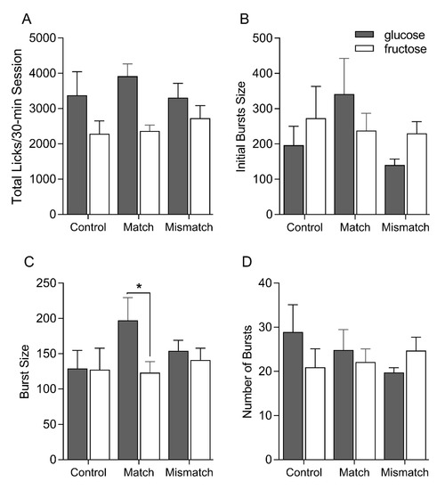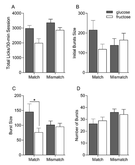 Mean ± SEM total licks (A), initial bursts size (B), overall burst size (C) and overall number of bursts (D) on the post-conditioning single-bottle 0.316 M glucose and fructose intake test sessions for Control, Matched and Mismatched groups. Significant differences are indicated by asterisks (*).