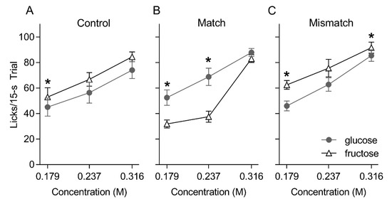 Mean ± SEM licks to three concentrations of glucose and fructose presented in randomized order in 15 s trials for the Control (A), Matched (B) and Mismatched (C) training groups during the post-conditioning brief access taste test. Asterisks (*) indicate significant pair-wise differences (glucose versus fructose).