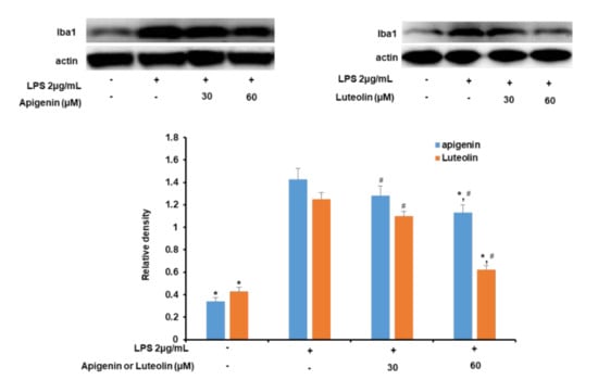 3.2. Effects of Apigenin and Luteolin on Iba-1 Expression in Stimulated Microglia