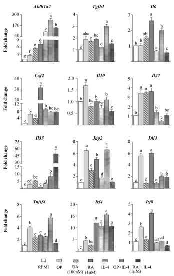 There is evidence for a positive feedback loop of RA on its own synthesis by activation of ALDH enzymes or RA receptors, which induce DCs to produce RA, biologically active TGF-β, and IL-6 [4,6,25]. Accordingly, when used for BM-DC stimulation, RA, particularly at the highest concentration assayed (with the exception of Il33), enhanced the expression of Aldh1a2, Tgfb1, Il6, and Gsf2, as well as that of Il27, Il33, Jag2, Dll4, Tnfsf4, Irf4, and Irf8 in BM-DCs (Figure 1). In general terms, RA and OP exerted analogous effects, except for their different influence on the regulation of Il10 and Il6 (Figure 1).