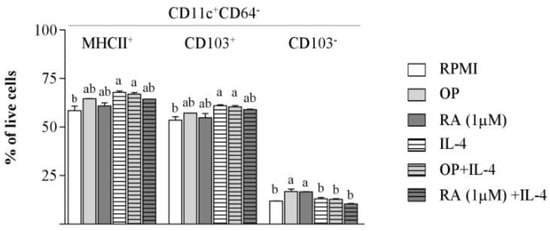 OP increases the proportion of CD11+ CD64− CD103− cells in BM-DC cultures. BM-DCs from naïve mice were cultured for 24 h without stimuli (RPMI), or with OP, RA, IL-4, OP+IL-4, or RA+IL-4. The percentage of MHCII+, CD103+, and CD103− DCs (CD11c+ CD64−) cells within the total population of live cells was assayed by flow cytometry. Results of a representative experiment performed in triplicate are shown. Data are means ± SEM. Different letters indicate statistically significant differences (p < 0.05) calculated using one-way analysis of variance (ANOVA), followed by Tukey’s post-hoc test.