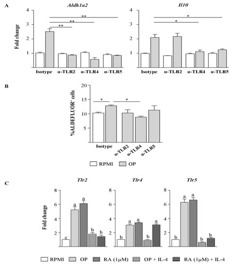 Because it has been described that TLR signalling causes ALDH1A2 induction in DCs [6,26,27], we assessed the stimulation of BM-DCs with OP while inhibiting the pathways initiated by TLRs by the use of neutralising antibodies against the extracellular receptors TLR2, TLR4, and TLR5. Blockade of each of these TLRs abrogated the effect of OP on Aldh1a2 expression (Figure 3A) and decreased ALDH activity, as measured by the ALDEFLUOR assay, although only neutralisation of TLR4 led to a significant reduction (Figure 3B). Blockade of TLR4 and TLR5 also inhibited Il10 expression (Figure 3A). Furthermore, the culture of BM-DCs with OP or RA enhanced the expression of Tlr2, Tlr4, and Tlr5 (Figure 3C), an effect similarly observed on MLN-DCs (Figure S2A), while concomitant addition of IL-4 downregulated TLR genes in BM-DCs, with the only exception of RA plus IL-4 on Tlr4 (Figure 3C).