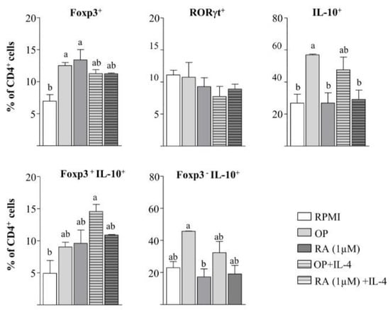 The effect of DCs incubated with different stimuli on CD4+ T cell phenotype was examined (Figure 4). OP- and RA-pulsed BM-DCs enhanced Foxp3 expression and did not change RORγt expression on co-cultured CD4+ T cells, although OP mainly increased the percentage of IL-10+ cells and, particularly, that of Foxp3− IL-10+ cells (Tr1 cells). Despite the synergistic influence of the joint addition of OP or RA and IL-4 on Aldh1a2 expression in BM-DCs, the level of Foxp3+ cells was not further enhanced with respect to OP or RA alone (Figure 4). This might be attributable to the observation that the combined treatments did not exert a significant added effect on Tgfb1 expression in BM-DCs (Figure 1), and TGF-β, which was deliberately not added to the culture, is the limiting factor in Foxp3 differentiation [10].