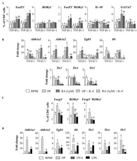 Since T cells are known to express TLRs, and thus they could react to OP, we next assessed the effects of OP on CD4+ T cells stimulated with anti-CD3 and anti-CD28 without the intermediation of DCs. In the absence of exogenous TGF-β, neither OP nor RA increased the expression of Foxp3, RORγt, or IL-10 in CD4+ T cells from naïve mice (Figure 5A), despite the fact that they did upregulate Aldh1a1, Aldh1a2, Tgfb1, and Il6 expression (Figure 5B) and increased ALDH activity, as measured by the ALDEFLUOR assay (Figure S3A). On the other hand, the expression of Tlr2, Tlr4, or Tlr5 was not enhanced (Figure 5B). Similar results were obtained when TGF-β was added to the culture (Figure 5A,B). However, when combined with IL-4, OP and RA significantly enriched the proportion of Foxp3+ cells and double-positive Foxp3+ RORγt+ cells, despite the proportion of RORγt+ cells remaining unchanged (Figure 5C). OP+IL-4 and RA+IL-4 also induced Th2 differentiation, as they significantly augmented IL-10+ and GATA3+ cells. Notably, in the presence of TGF-β, the generation of Foxp3+ cells was promoted, while that of Th2 cells was inhibited (Figure 5A). After 96 h of the culture of CD4+ T cells from naïve mice with OP+IL-4 or RA+IL-4, no upregulation of Aldh1a1, Aldh1a2, Tgfb1, or Il6 genes could be detected (Figure 5B). However, stimulation of CD4+ T cells in the presence of the ALDH inhibitor DEABovercame the enhancing effect of OP+IL-4 and RA+IL-4 on Foxp3 induction ( Figure S3B), thus showing the mediation of RA synthesis in Foxp3+ cell development.