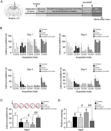 Effects of Cf-hGP on L. plantarum-induced cognitive improvement in aged rats. Cf-hGP (15 mg/kg) or L. plantarum (109 colony-forming units (CFU)/rat/day) was orally administered once a day for 4 weeks (A). After four weeks, acquisition training was performed (B). The co-treatment with Cf-hGP and L. plantarum synergistically downregulated the latency and upregulated the frequency of platform crossings compared to mono-treatment (C,D). * p < 0.05 versus untreated rats; # p < 0.05 versus the rats treated with only Cf-hGP or LP; ## p < 0.05 versus the rats co-treated with Cf-hGP and LP. Cf-hGP, Capsosiphon fulvescens glycoprotein; LP, Lactobacillus plantarum; BDNF, brain-derived neurotrophic factor; WD, withdrawal period.