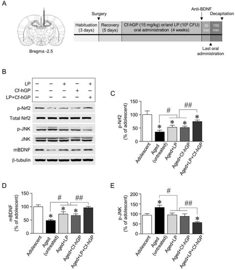 Expression of mature BDNF and phosphorylation of nuclear factor erythroid 2-related factor 2 (Nrf2) and c-Jun N-terminal kinase (JNK) in the dorsal hippocampus by co-treatment with Cf-hGP and L. plantarum. Following oral administration of Cf-hGP (15 mg/kg) or L. plantarum (109 CFU/rat/day) once a day for 4 weeks, expression of mature BDNF (mBDNF) and phosphorylation of Nrf2 and JNK in the dorsal hippocampus were measured by immunoblotting (A,B). The co-treatment with Cf-hGP and L. plantarum synergistically increased Nrf2 phosphorylation and mBDNF expression compared to mono-treatment, but JNK phosphorylation was decreased (C–E). * p < 0.05 versus adolescent rats; # p < 0.05 versus aged untreated rats; ## p < 0.05 versus the rats treated with only Cf-hGP or LP. Cf-hGP, Capsosiphon fulvescens glycoprotein; LP, Lactobacillus plantarum; p-Nrf2, phosphorylated Nrf2; p-JNK, phosphorylated JNK.
