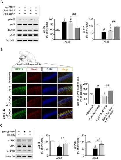 Effects of BDNF signaling activated by co-treatment with Cf-hGP and L. plantarum on Nrf2 and JNK phosphorylation and their interactions. The co-treatment-induced increase in Nrf2 phosphorylation was downregulated by functional blocks with the anti-BDNF antibody (1 µg/µL) (A). According to the double immunofluorescence staining, the co-treatment significantly downregulated the increase in glucose-regulated protein 78 expression in aged rats, which was overturned by blocks with the anti-BDNF antibody (1 µg/µL) (B). Inhibition of Nrf2 with ML385 (an inhibitor of Nrf2, 100 pmol/µL) overturned the co-treatment-induced decrease in JNK phosphorylation and GRP78 expression (C). * p < 0.05 versus adolescent rats; # p < 0.05 versus aged untreated rats; ## p < 0.05 versus the rats co-treated with Cf-hGP and LP. Cf-hGP, Capsosiphon fulvescens glycoprotein; LP, Lactobacillus plantarum; recBDNF, recombinant BDNF; dHP, dorsal hippocampus; NeuN, neuronal nuclear antigen; DAPI, 4′,6-diamidino-2-phenylindole; GRP78, glucose-regulated protein 78. The scale bar represents 100 µm.