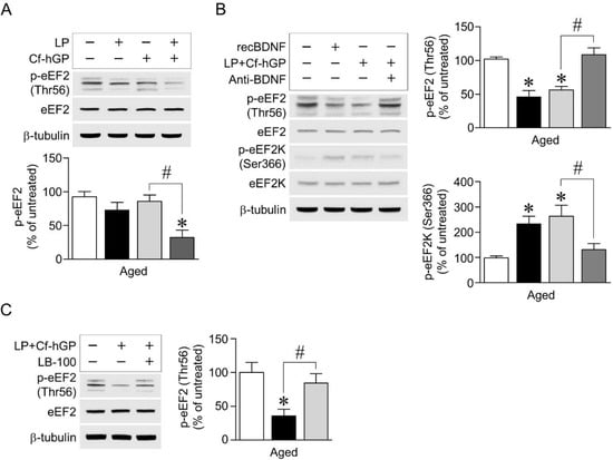 Regulation of BDNF-mediated phosphorylation of eukaryotic elongation factor 2 (eEF2) by co-treatment with Cf-hGP and L. plantarum. Phosphorylation of eEF2 at threonine 56 was decreased by co-treatment with Cf-hGP and L. plantarum, but not by any mono-treatment (A). Phosphorylation of the eEF2 kinase was upregulated, while eEF2 phosphorylation was downregulated by the co-treatment, which was overturned by functional blocks with the anti-BDNF antibody (1 µg/µL) (B). The co-treatment-induced decrease in eEF2 phosphorylation was downregulated by inhibition of protein phosphatase 2A (PP2A) with LB-100 (an inhibitor of PP2A, 1.5 mg/kg) (C). * p < 0.05 versus untreated rats; # p < 0.05 versus the rats co-treated with Cf-hGP and LP. Cf-hGP, Capsosiphon fulvescens glycoprotein; LP, Lactobacillus plantarum; eEF2K, eEF2 kinase; p-eEF2K, phosphorylated eEF2K; Thr56, threonine 56; Ser366, serine 366.