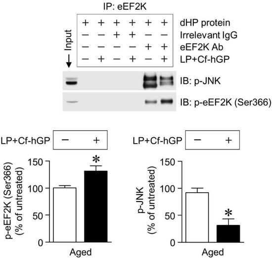 Effect of co-treatment with Cf-hGP and L. plantarum on the eEF2 kinase-JNK interaction. JNK was immunoprecipitated using the eEF2 kinase antibody. The interaction between the eEF2 kinase and JNK was downregulated by co-treatment with Cf-hGP and L. plantarum. Further, a significant decrease in JNK phosphorylation was accompanied by an increase in eEF2 kinase phosphorylation. * p < 0.05 versus untreated rats; unpaired t-test. Cf-hGP, Capsosiphon fulvescens glycoprotein; LP, Lactobacillus plantarum; eEF2K, eEF2 kinase; dHP, dorsal hippocampus; IP, immunoprecipitation; IgG, immunoglobulin G; Ab, antibody.
