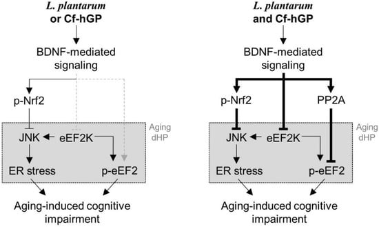 Scheme of a proposed mechanism of underlying effects of Cf-hGP on L. plantarum-induced cognitive improvement in aged rats. Chronic administration of Cf-hGP with L. plantarum synergistically attenuated cognitive impairment in aged rats through BDNF-mediated control of Nrf2 and eEF2 signaling in the dorsal hippocampus. Cf-hGP, Capsosiphon fulvescens glycoprotein; LP, Lactobacillus plantarum; dHP, dorsal hippocampus; ER, endoplasmic reticulum.