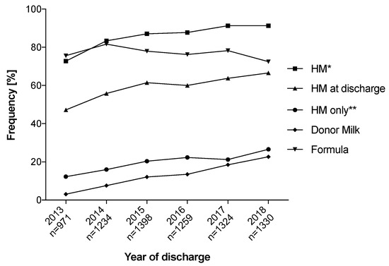 Changes in enteral feeding on German Neonatal Network (GNN) neonatal intensive care units (NICUs) between 2013 and 2018. HM, human milk; * includes all infants that were exposed to HM; ** includes all infants that were fed exclusively HM (own mother and/or donor).