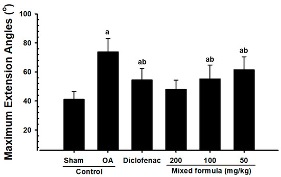 Significant increases in maximum knee extension were observed in OA control rabbits compared with the sham control rabbits. However, the maximum extension of the knee decreased significantly in the PCP:EC:AR (50, 100, and 200 mg/kg)-treated rabbits compared with the OA control rabbits, in a dose-dependent manner (Figure 3).
