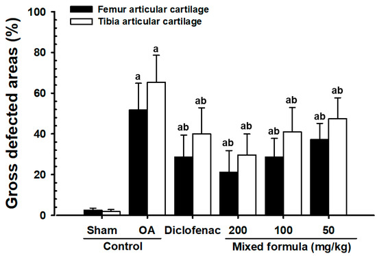 The femoral and tibial gross articular defect areas increased in the OA control, compared with sham control rabbits. In contrast, all PCP:EC:AR (50, 100, and 200 mg/kg)-treated rabbits showed dose-dependent decreases in gross femoral and tibial AC defect areas (Figure 4, Figure 5 and Figure 6).