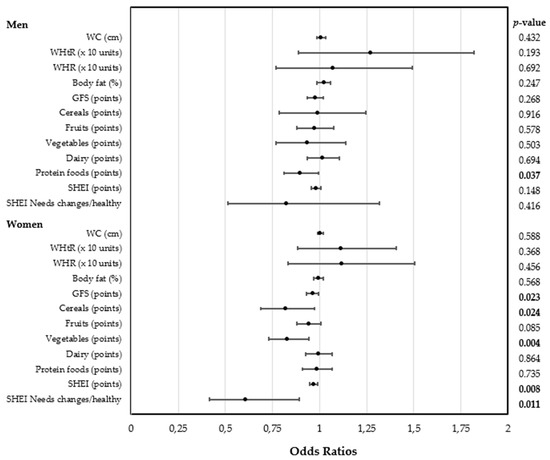 Setting NLR ≥ 2.8 (p80) as the cut-off point to define inflammation in men, it was observed that those men with worse inflammatory status had higher body-fat percentage and WHtR, indicative of abdominal obesity, than those with better inflammatory status (Table 4). In particular, the higher the values of body-fat percentage and WHtR were, the greater the odds of developing a high inflammatory state was (unadjusted model) (OR 1.037 (1.001–1.074), p = 0.042; and OR 1.610 (1.151–2.251), p = 0.005, respectively). Signification was lost when adjusted by covariates (Figure 1). However, it was found that those males with worse inflammatory state had lower scores for protein foods (unadjusted model: 0.905 (0.823–0.997); p = 0.043, adjusted model by covariates: 0.898 (0.812–0.993); p = 0.037). In addition, in women, the higher SHEI and GFS scores were, the less the odds to present a high inflammatory state was in unadjusted model (OR 0.971 (0.950–0.993), p = 0.010; and OR 0.968 (0.937–0.999), p = 0.010, respectively) and adjusted model by covariates (OR 0.970 (0.948–0.992), p = 0.008; and OR 0.963 (0.932–0.995), p = 0.023, respectively) (Figure 1). Furthermore, following more appropriate diets (with a SHEI score > 80 points) was a protective factor against a high inflammatory state (NLR ≥ 2.4) in unadjusted model and adjusted model by covariates (OR 0.636 (0.438–0.923); p = 0.017 and OR 0.609 (0.416–0.891); p = 0.011, respectively). Similarly, achieving the objectives of cereal and vegetable servings was also a protective factor for a high inflammatory state in unadjusted model (cereals. OR 0.846 (0.714–1.003); p = 0.054; vegetables: OR 0.837 (0.737–0.950); p = 0.006) and adjusted model by covariates (cereals: OR 0.818 (0.688–0.974); p = 0.024; vegetables: OR 0.829 (0.730–0.942), p = 0.004).