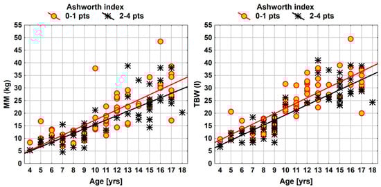 Another interesting finding of the current study is that children with higher muscle tone, i.e., higher Ashworth index, presented significantly lower values of FM, FFM, MM, BCM and TBW (p < 0.05). The above effect of muscle tone in body composition of the children with CP is also visualised in Figure 2, by means of linear regression (for the measures of MM and TBW). These findings are linked with the increased caloric intake needs proportional to the increased muscle tone. This results in a reduction of all the components of body composition, including MM and TBW, which has been shown in our observations. In a study by Liu et al., baclofen was administered by the intrathecal route to 12 children with CP which resulted in decreased muscle tone (according to Modified Ashworth Scale) and reduced caloric intake needs, and consequently a lower risk of undernutrition []. A study by Tomoum et al. assessed nutritional status in children with CP and reported a statistically significant reduction in TBW, FM, FFM, fat percentage and BMR in the patients’ group compared to the control group (p < 0.01); the effect was particularly visible in the children with severe motor handicap and or motor dysfunction []. It may be difficult to interpret the evidence reported by the scarce related studies, including the current findings, because of the relatively lower combined values of FFM (MM and TBW) frequently result from lower MM [] and bone mass [] as a result of their immobility []. The present findings also show no interaction between muscle tone and gender, at a significance level of p < 0.05 in all the relevant measures of body composition. The current findings should be supported with further research to be conducted in a larger group of children with CP.